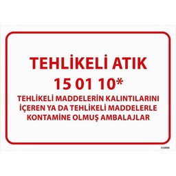 “Tehlikeli Atık Uyarı Levhası – Kontamine Olmuş Ambalajlar (15-01-10)”, kimyasal, biyolojik veya tehlikeli madde bulaşmış ambalaj atıklarının doğru şekilde toplanmasını