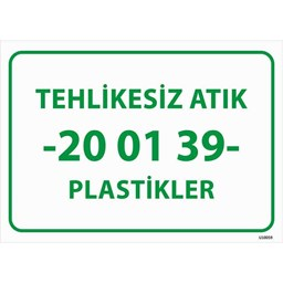 Tehlikesiz Atık 20-01-39 Plastikler Uyarı Levhası, plastik atıkların doğru şekilde ayrıştırılması ve geri dönüşüm sürecine uygun olarak toplanması için kullanılan
