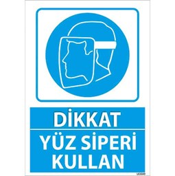 Yüz Siperi Kullan Uyarı Levhası, çalışanların ve ziyaretçilerin yüz siperi takmaları gerektiğini hatırlatarak, özellikle sağlık sektörü, laboratuvarlar, fabrikalar ve Covid-19