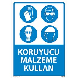 “Koruyucu Malzeme Kullan Uyarı Levhası”, iş sağlığı ve güvenliği standartlarına uygun olarak çalışanların kişisel koruyucu ekipman (KKE) kullanmasını hatırlatan önemli