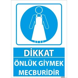 Önlük Giymek Mecburidir Uyarı Levhası, hijyen ve iş güvenliği gerektiren ortamlarda çalışanlara önlük giymeleri gerektiğini hatırlatmak amacıyla kullanılan bir güvenlik