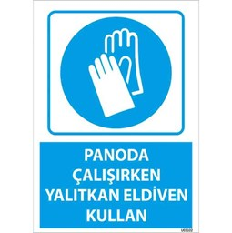Panoda Yalıtkan Eldiven Kullan Uyarı Levhası, elektrik panolarında çalışan personeli elektrik çarpması riskine karşı uyarmak için tasarlanmış güvenlik levhasıdır. Elektriksel