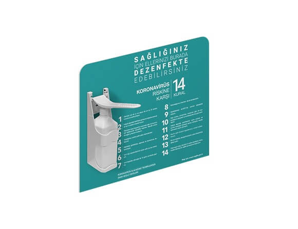 Dezenfekten Standı HakkındaEl hijyeni; bakteri, mikrop ve virüslerin bulaşıcılığını azaltma amacıyla alınması gereken önlemlerin başında geliyor. Hastane, AVM, restoran, mağaza, eczane, market gibi ortak ve halka açık alanlarda, özellik asansör ve mekan girişlerinde hastalıkların bulaşıcı etkisini azaltmak ve hijyen önlemlerini artırmak amacıyla dirsek basmalı veya sensörlü olarak sunduğumuz duvar tipi dezenfektan standı tüm iç mekan kullanımlarına uygundur. Kapalı mekan girişlerinde artık olmazsa olmaz dezenfektan stantları, hem kendi sağlımız hem de müşterilerinizin sağlığını korumada önemli bir rol oynamaktadır.Kolay kurulumu ve dayanıklı yapısıyla rahat bir kullanım sunar. Online sipariş verme kolaylığı ve kredi kartına tek çekim halinde dirsek basmalı duvar tipi dezenfektan standı veya sensörlü duvar tipi dezenfektan standı siparişinizi reyhanlireklam.com’dan verebilirsiniz.Ürün Özellikleri:Ürün demonte gelmektedir. Dezenfektan mekanizmasını kolaylıkla monte edebilirsiniz.Reyhanlı içi Montaj servisimiz vardır.Dirsek basmalı dispenser mika sert plastikten üretilmiştir.Dezenfektan dispenserlerinin kapasitesi 1 litredir.Ürüne dezenfektan dahil değildir. Kolay dolum yapılabilir.Birden fazla satın alındığında ürünler birlikte indirim yapılmaktadır.