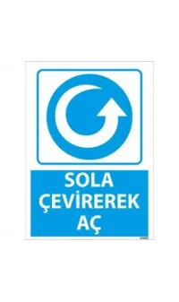 Sola Çevirerek Aç Uyarı Levhası, kapıların veya makinelerin doğru şekilde açılmasını sağlamak amacıy..