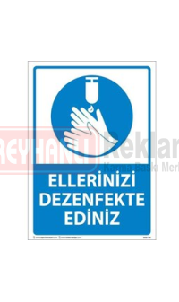 Etiketler: Ellerinizi dezenfekte edin levhası, hijyen uyarı levhası, dezenfektan kullanım hatırlatıcısı, enfeksiyon öncesi önlem levhası, temizlik hatırlatıcı levha, sağlık ve güvenlik uyarısı, dezenfeksiyon levhası.