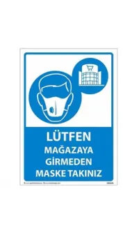 Lütfen Mağazaya Girmeden Maske Takınız Uyarı Levhası, mağazalar, alışveriş merkezleri ve diğer perakende satış alanlarında hijyen ve sağlık güvenliğini sağlamak için tasarlanmıştır. Ziyaretçilere mağazaya girmeden önce maske takmaları gerektiğini hatırlatan bu levha, sağlık protokollerine uyum sağlamayı teşvik eder. Dayanıklı malzemeden üretilen ve iç mekanlarda kullanılmaya uygun bu tabela, çalışanlar ve müşteriler için farkındalık yaratır ve mağaza içindeki hijyen standartlarının korunmasına yardımcı olur.