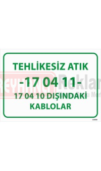 Tehlikesiz Atık 17-04-11 – 17-04-10 Dışındaki Kablolar Uyarı Levhası, tehlikesiz sınıfa giren kablo atıklarının ayrıştırılması ve yönetilmesi için kullanılan bir uyarı tabelasıdır. Elektrik tesisatları, sanayi tesisleri, geri dönüşüm merkezleri ve atık toplama alanlarında kullanıma uygundur. 17-04-11 atık kodu, bakır, alüminyum veya diğer metallerden oluşan, tehlikeli madde içermeyen kabloları tanımlamaktadır. Bu levha, atık yönetimini kolaylaştırarak çevre dostu geri dönüşüm süreçlerine katkı sağlar. Dayanıklı malzemeden üretilmiş olup, iç ve dış mekan kullanımı için uygundur.